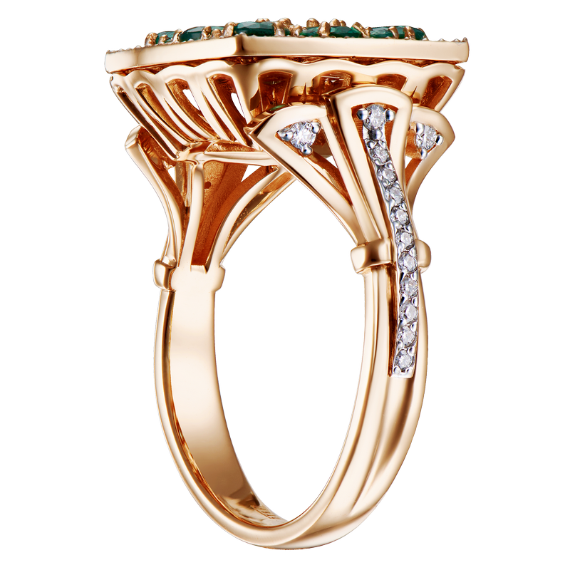 Кольцо VERTE олицетворяет новую грань аристократизма, где мощная эстетика говорит о глубоком понимании красоты, неподвластной времени. Благородное красное золото, природные изумруды и бриллианты идеальной чистоты создают украшение для личности, чей стиль — это безошибочное чувство меры и смелость быть первой. Оно не просто дополняет образ, а становится его смысловым центром, выбором тех, кто управляет реальностью и инвестирует в вечное, создавая собственную историю.